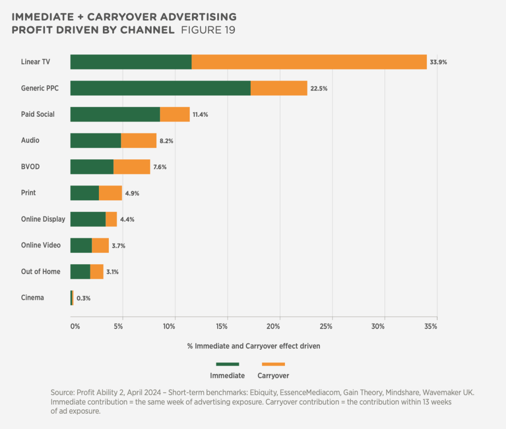 Linear TV is still seen by many businesses as a brand-building, long-term driving media channel. However, this research continues to show its ability to perform in the short term, with immediate profit effects (meaning effects within the same week) at 20.5%, just behind Generic PPC (30.5%). Audio and BVOD also deliver strong immediate effects. This suggests that brands restricting themselves to just “digital channels” aka search and social, for immediate response, are leaving money on the table.