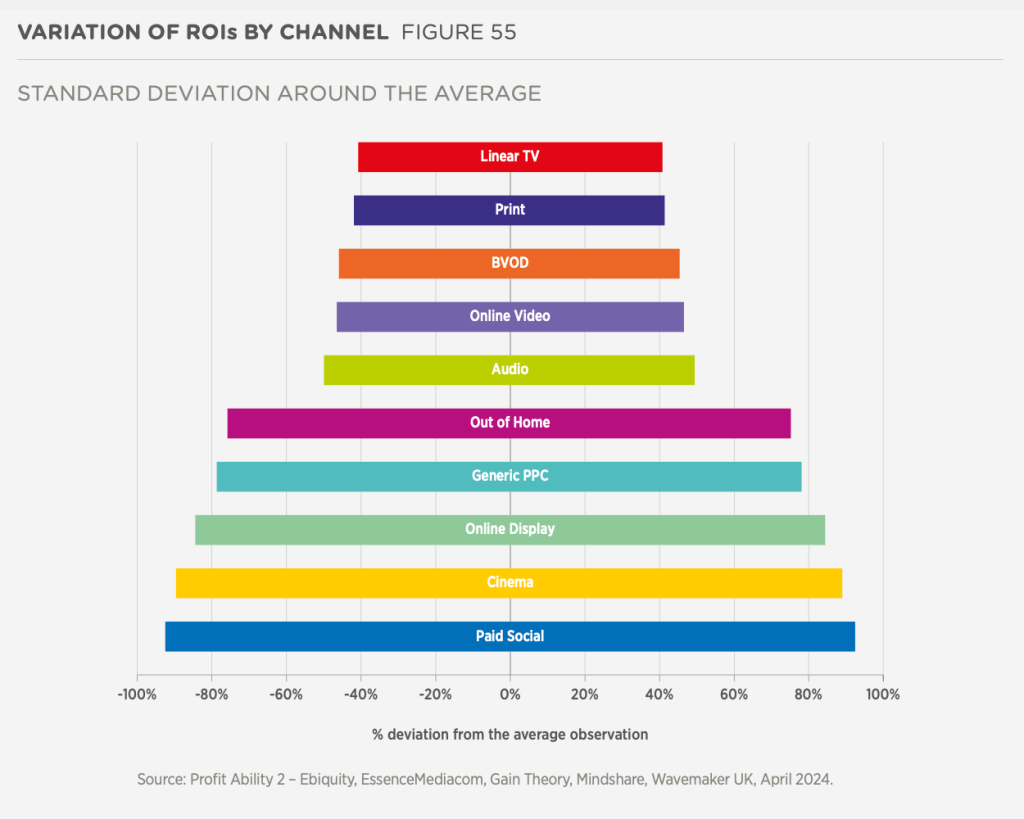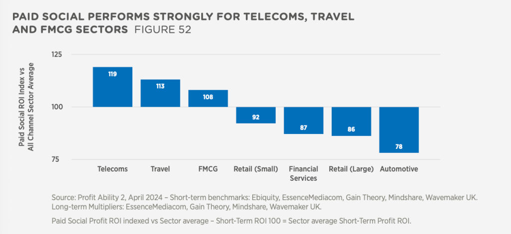 It also shows the highest variability in results – meaning some campaigns perform very well while others perform poorly, with a large spread between the best and worst results, making it the riskiest channel for investment. This doesn’t mean social isn’t effective, and indeed it shows robust performance particularly in sectors like telecoms, travel and FMCG where it often outperforms other channels. However, for most sectors it typically falls in the middle or bottom of the pack, suggesting many brands might benefit from re-evaluating their investment levels to make their total media mix more efficient.